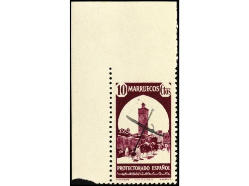 ** MARRUECOS. Ed. 203. 10 cts. carmín lila. Margen superior SIN DENTAR, sellos anulados por aspa a tinta al ser "defectuosos". Muy raro y no reseñado, sólo existen 10 ejemplares.