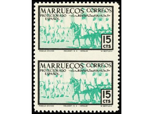 ** COLONIAS ESPAÑOLAS: MARRUECOS. Ed. 345spv. 15 cts. verde y negro. Pareja vertical SIN DENTAR EN MEDIO. MAGNÍFICO y MUY RARO.