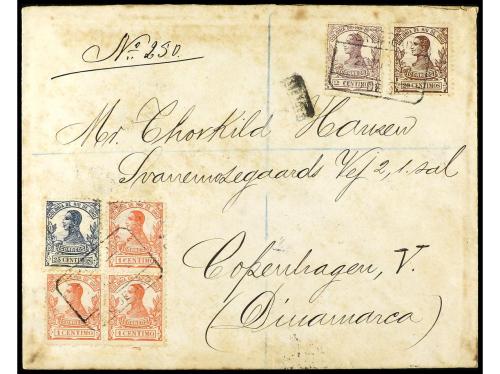 COLONIAS ESPAÑOLAS: RIO DE ORO. Ed. 65 (3), 66, 70, 71. 1913. RÍO DE ORO a DINAMARCA. 1 ctvo. rosa (3), 2 ctvos. lila, 20 ctvos. castaño y 25 ctvs. azul en carta certificada, manchas del tiempo, al dorso llegada.