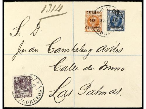 COLONIAS ESPAÑOLAS: RIO DE ORO. Ed. 46, 55, 56. 1910. RÍO DE ORO a LAS PALMAS. 10 cts. s. 5 pts. azul, 10 cts. s. 10 pts. naranja y 20 cts. carta certificada, al dorso llegada.