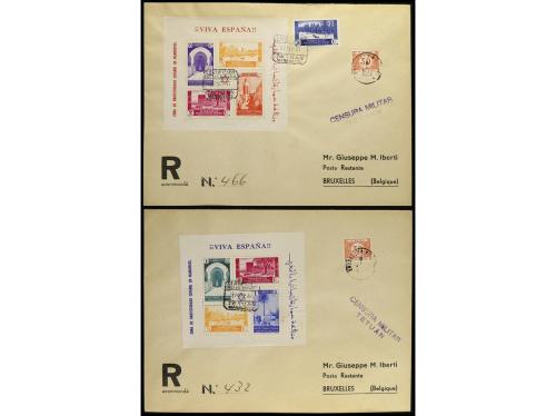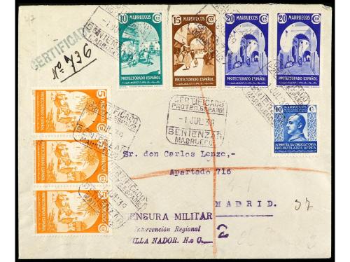 COLONIAS ESPAÑOLAS: MARRUECOS. Ed. 196 (3), 197/98, 199 (2). 1939. BENIENZAR a MADRID. Carta certificada, precioso franqueo y rara Censura Militar de Villa de Nador.