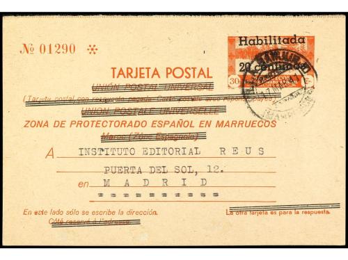 COLONIAS ESPAÑOLAS: MARRUECOS. 1940. VILLA SANJURJO a MADRID. Entero postal de 20 cts. sobre 30 cts. rojo (tarjeta de vuelta Ed. 27). MUY RARO.
