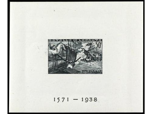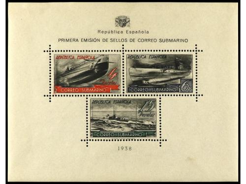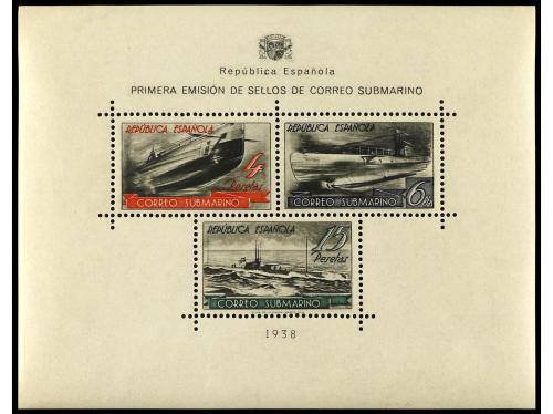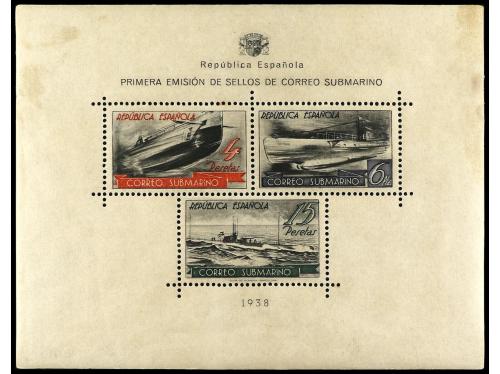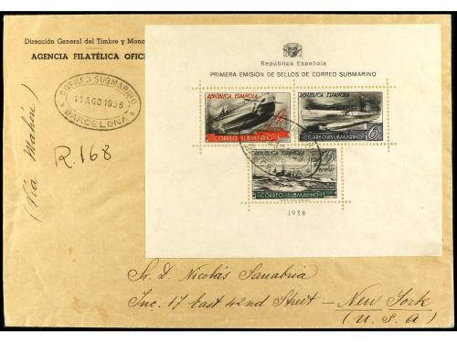 ESPAÑA. Ed. 781. 1938. BARCELONA a NEW YORK. H.B. circulada por correo certificado por submarino hasta Mahón y de allí por correo hasta U.S.A. Al dorso llegada. RARÍSIMA, la hojita bloque circulada al exterior es extraordinariamente rara, sólo conocemos esta que ponemos a la venta.