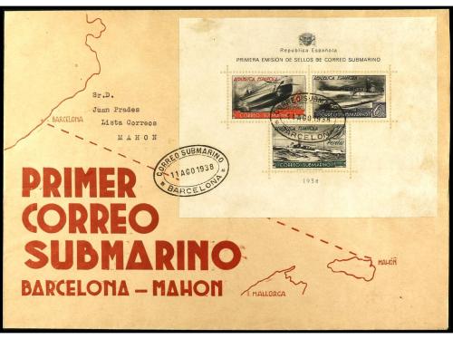 ESPAÑA. Ed. 781. 1938. BARCELONA a MAHÓN. HB circulada en el sobre conmemorativo del viaje por correo submarino, al dorso llegada y firma manuscrita "El Ambulante Submarino Tomás Orós". RARA.