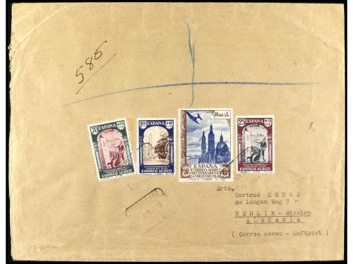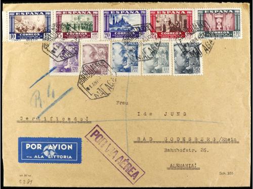 ESPAÑA. Ed. 889/93, 872, 922/25. 1940. MÁLAGA a ALEMANIA. Carta certificada, espectacular franqueo, al dorso llegada.