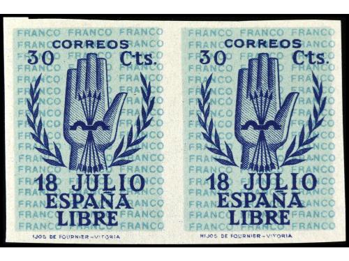 ** ESPAÑA. Ed. 853s (2). 30 cts. azul sobre azul claro. Pareja SIN DENTAR, LETRAS DEL FONDO DESPLAZADAS y un sello pie de imprenta "NOS". RARO. Cat. +660€.