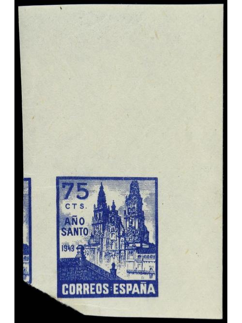 * ESPAÑA. Ed. 969s. 75 cts. azul. Esquina de hoja SIN DENTAR. ESPECTACULAR y posiblemente ÚNICO EJEMPLAR CONOCIDO. Leves pliegues sin importancia. Cert. COMEX.