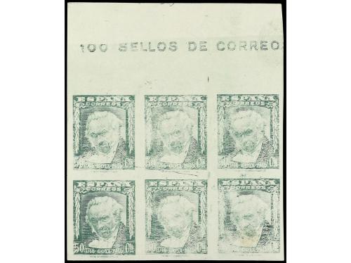 ** ESPAÑA. Ed. 1006ibs (4). 50 cts. verde. Bloque de 6 SIN DENTAR, IMPRESIÓN BORROSA. RARO. Cert. CEM.
