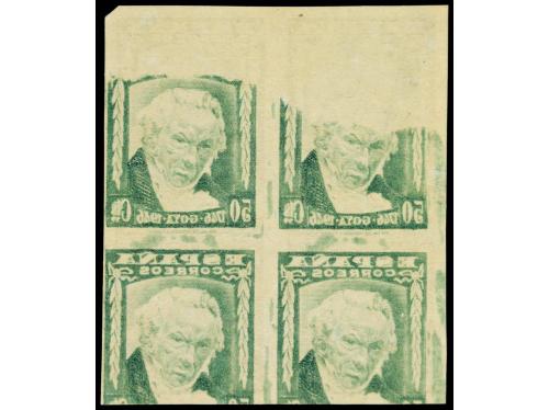 ** ESPAÑA. Ed. 1006egs (4). 50 cts. verde. Bloque de cuatro SIN DENTAR, IMPRESO PARCIAL EN ESPEJO AL DORSO. No reseñado. RARO. Cert. CEM.