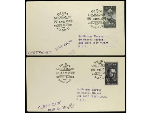 ESPAÑA. Ed. 1124/25. 1953. LEGAZPI y SOROLLA. Serie completa en 2 cartas certificadas de MADRID a NUEVA YORK con mat. PRIMER DÍA DE EMISIÓN. Al dorso llegada. Cat. 560€.