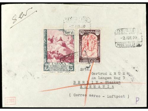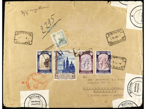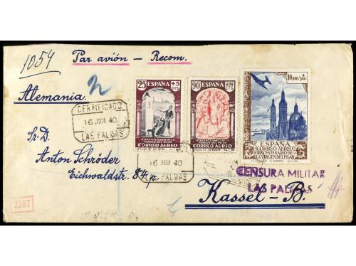 ESPAÑA. Ed. 909/11, 913. 1940. LAS PALMAS a ALEMANIA. Carta certificada, precioso franqueo, marcas y cierres de Censura Militar alemana y llegada.
