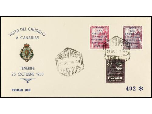 ESPAÑA. Ed. 1083 y 1083A/B. 1950. Serie de correo y aéreo en sobre con mat. de Tenerife del 23-oct-1950 Primer día de circulación. Excelente calidad. Cert. CEM.