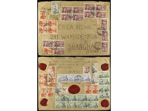 ESPAÑA. Ed. 991 (6), 992 (14), 917, 923, 941 (3), 943 (3), 944 (3), 945 (12), 991 (7). 1946. BARCELONA a SHANGHAI (China). Circulada por correo aéreo certificado con un espectacular franqueo en anverso y reverso, pequeños defectos inevitables en un sobre de este tamaño. Espectacular y muy raro franqueo.