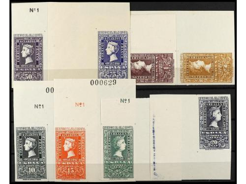 * ESPAÑA. Ed. 1015/16. REIMPRESIONES. Conjunto de 7 sellos en colores diversos, impresos fraudulentamente con las planchas originales. INTERESANTE.