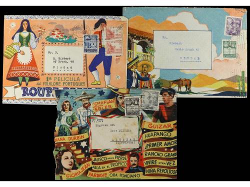 ESPAÑA. 1940-48. Conjunto de 3 sobres de la distribuidora cinematográfica Rey Soria Films con espectaculares ilustraciones a todo color.