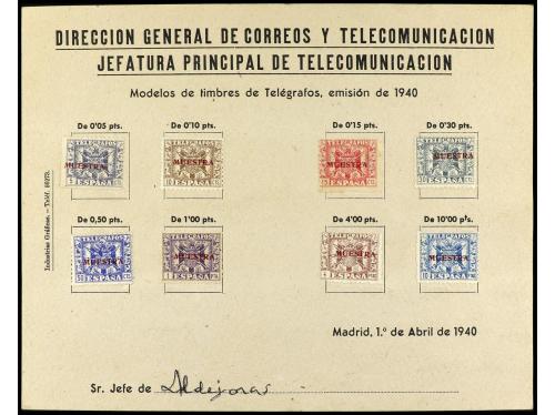 ESPAÑA: TELEGRAFOS. Ed. 76/84 falta el nº 81 que no se emitió hasta 1942. TELÉGRAFOS. HOJA MODELO con los sellos adheridos de la emisión del 1 de abril de 1940 habilitados MUESTRA en rojo. Enviada a las Administraciones para dar a conocer la nueva emisión en curso. Muy pocas conocidas, de esta emisión es la primera que vemos.