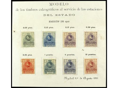 ESPAÑA: TELEGRAFOS. Ed. 47/54. TELÉGRAFOS. Fragmento de la HOJA MODELO con los sellos adheridos de la emisión del 1 de agosto de 1912. Enviada a las Administraciones como Muestra para dar a conocer la nueva emisión en curso. Muy pocas conocidas (citada en el Edifil Especializado pag. 89).