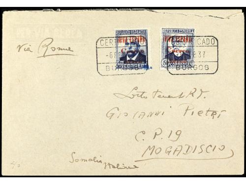 ESPAÑA E. LOCALES PATRIOTICAS: BURGOS. Ed. 68, 69. 1937. BURGOS a MOGADISCIO (Somalia). 40 cts. azul y 50 cts. azul, al dorso llegada. Rara destinación.