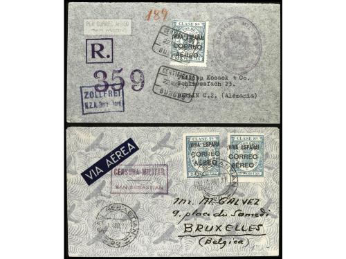 ESPAÑA E. LOCALES PATRIOTICAS: BURGOS. Ed. 59, 61. 1937. Dos cartas circuladas a ALEMANIA y BÉLGICA con pólizas habilitadas para el Correo Aéreo 1,20 pts. y 2,40 pts. Cert. GRAUS.