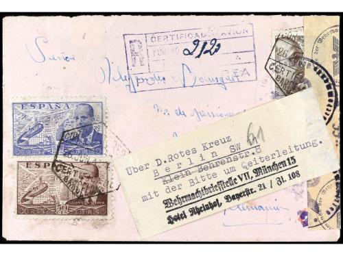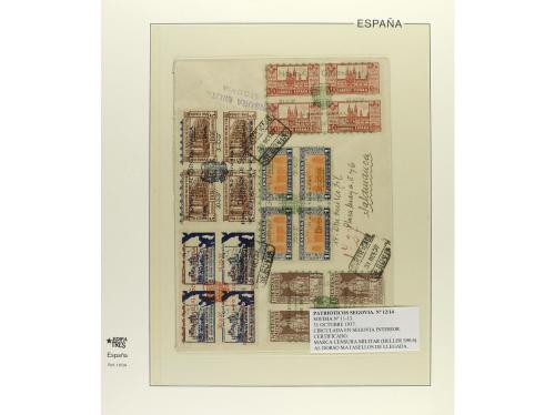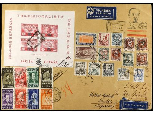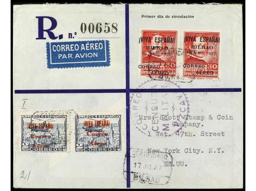 ESPAÑA E. LOCALES PATRIOTICAS: BURGOS. Ed. 72 (2), 9. 1937. BURGOS a U.S.A. Carta certificada, precioso franqueo, al dorso llegada.
