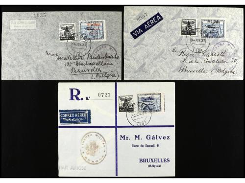 ESPAÑA E. LOCALES PATRIOTICAS: BURGOS. Ed. 72, 72hcca, 72hccb. 1937. BURGOS a BRUSELAS. Circuladas con sellos de 2 pts. habilitaciones en rojo, azul y negro, al dorso llegadas.