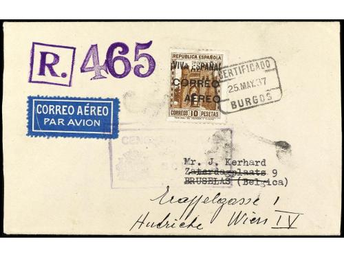 ESPAÑA E. LOCALES PATRIOTICAS: BURGOS. Ed. 80. 1937. BURGOS a BRUSELAS y reexpedida a VIENA. 10 pts. castaño carta certificada, al dorso llegada.