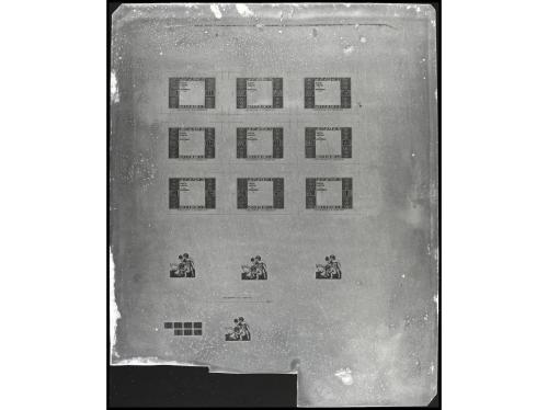 ESPAÑA. BENEFICENCIA. PLANCHAS LITOGRÁFICAS. Conjunto de 4 planchas metálicas con ejemplares en espejo, de diversos valores de la primera serie. 1ª: Ed. 1/8, 9 sellos (5 c.) repetido en posible minihoja, más centros. 2ª: hoja de 50 del 5 céntimos, sólo marcos. 3ª: hoja de 50 del 1 peseta, sólo marcas. 4ª: hoja de 50, sólo centros. RARÍSIMO. Ver foto en web.