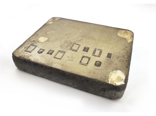 ESPAÑA. 1937. BENEFICENCIA.Serie Edifil 12/6. PIEDRA LITOGRÁFICA de la serie completa de Pedagogos. Están los cinco valores, dividido en marcos y centros. Tres leves fisuras que no afectan a la gran rareza de esta pieza. Peso 7,5 Kgs.