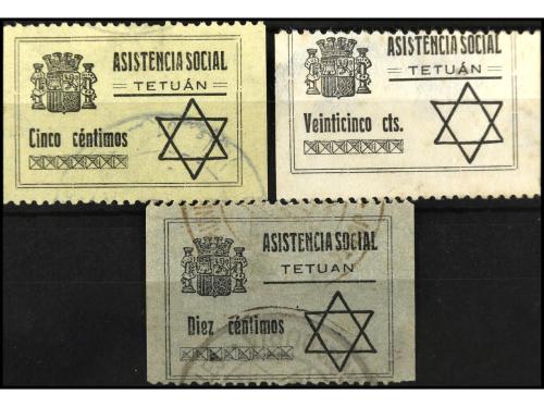 */° ESPAÑA GUERRA CIVIL. TETUÁN. 5 c. negro, 10 c. negro (no catalogado, rarísimo) y 25 c. Asistencia Social. (All. 12/3 + no catalogado).