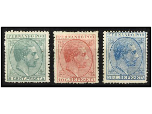 * COLONIAS ESPAÑOLAS: FERNANDO POO. Ed. 2/4. SERIE COMPLETA, 3 valores. 50 cts. azul leve línea de goma que traspasa al frente. Cat. 300€.