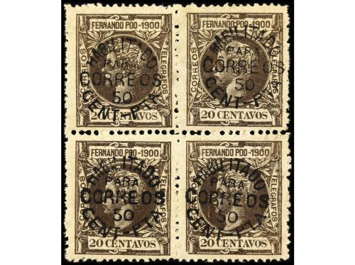 ** COLONIAS ESPAÑOLAS: FERNANDO POO. Ed. 94 (4). 50 cts. sobre 20 cts. castaño. Bloque de cuatro, bien centrado. Cat. +240€.
