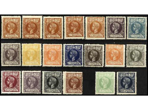 * COLONIAS ESPAÑOLAS: FERNANDO POO. Ed. 50/69. SERIE COMPLETA. 20 valores. 4 mils. pequeño punto claro. Valores clave, bien centrados; resto variado. RARA. Cat. 1.880€.