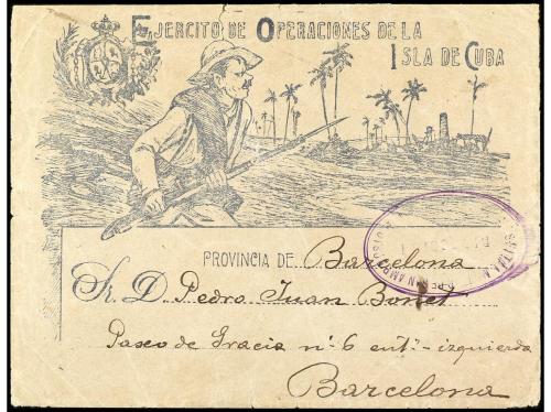 CUBA. 1896. Sobre ilustrado del EJÉRCITO DE OPERACIONES DE LA ISLA DE CUBA circulado a Barcelona. Marca de franquicia ESTAFETA MILITAR DE SAN AMBROSIO, al dorso llegada. PRECIOSO y RARO.