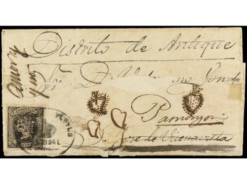 FILIPINAS. 1869. GUIMBAL a S. JOSÉ DE BUENAVISTA y reexpedida a PATNONGON (Antigua). Carta completa con texto circulada con sello de 3 1/8 cent. negro mat. ovalado PROVINCIA DE YLOYLO/GUIMBAL. Envuelta con defectos pero única carta conocida desde la población de Guimbal. Ex. col. "ISABELA".