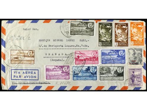 COLONIAS ESPAÑOLAS: GUINEA. Ed. 265, 269, 277/80, 285/6, 290 y 306/08. 1951. Certificado de BATA a GRANADA. Al dorso tránsito en SEVILLA. MUY BONITA.