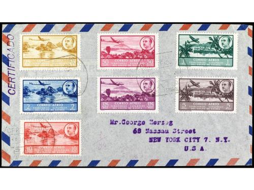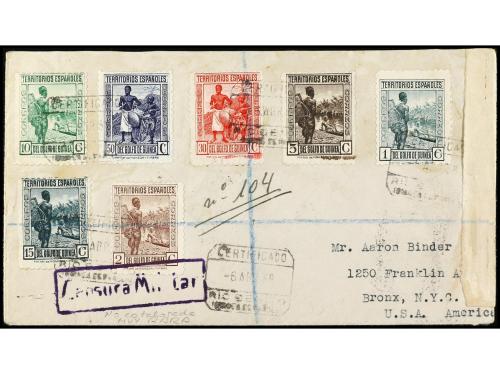 COLONIAS ESPAÑOLAS: GUINEA. Ed. 244/50. 1938. RIO BENITO a NUEVA YORK. Serie completa con mat. CERTIFICADO/RIO BENITO/GUINEA ESPAÑOLA y marca de CENSURA MILITAR en violeta. Al dorso llegada. MAGNÍFICA y RARA.