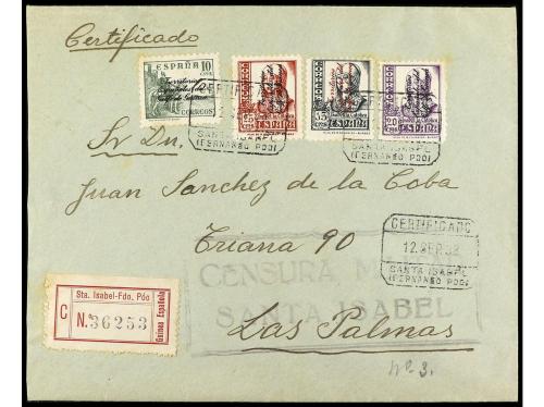 COLONIAS ESPAÑOLAS: GUINEA. Ed. 256/59. 1938. Certificado de SANTA ISABEL a LAS PALMAS. Serie completa. Marca de CENSURA MILITAR en violeta. Al dorso llegada. MUY BONITA.