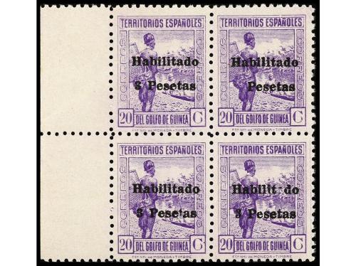 ** COLONIAS ESPAÑOLAS: GUINEA. Ed. 267 (4). 3 pts. sobre 20 cts. lila. Bloque de cuatro, incluyendo 267hp (cifra "3" omitida) y 267hpa (2ª letra "a" omitida). RARO. Cat. +172€.