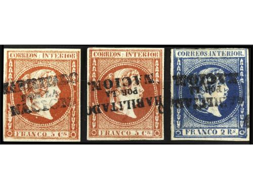 */(*) FILIPINAS. Ed. 20H, 20Hh y 20Jh. HABILITADOS POR LA NACIÓN. 5 c. rojo habilitación normal (sin goma) e INVERTIDA y 2 reales habilitación INVERTIDA. RAROS. Cat. 1.155€.