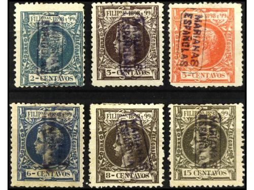 * COLONIAS ESPAÑOLAS: MARIANAS. Ed. 1/6. SERIE COMPLETA. 6 valores. MUY RARA. 3 y 8 c. sin goma. 5 c. punto claro, resto habitual conservación. Cert. COMEX.