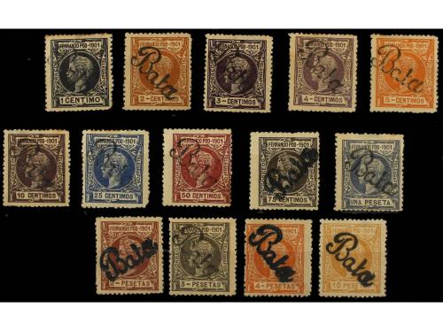 * COLONIAS ESPAÑOLAS: GUINEA. Ed. B1/14. EMISIÓN PROVISIONAL DE BATA. Serie completa. 14 valores. Muy bien centrados. Valor de 4 c. pequeño pliegue y 2 pts. punto claro. RARÍSIMA. Tirada 25 series completas. Cert. COMEX.