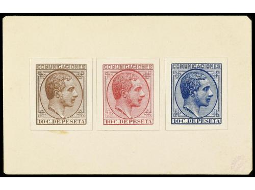 ESPAÑA. Ed. 192. 1878. 10 cts. castaño, 10 cts. carmín y 10 cts. azul PRUEBAS DE PUNZÓN adheridas sobre tarjeta de visita de Eugenio Juliá Jover grabador del sello. MUY INTERESANTE. (Gálvez 1044, 1054, 1064).