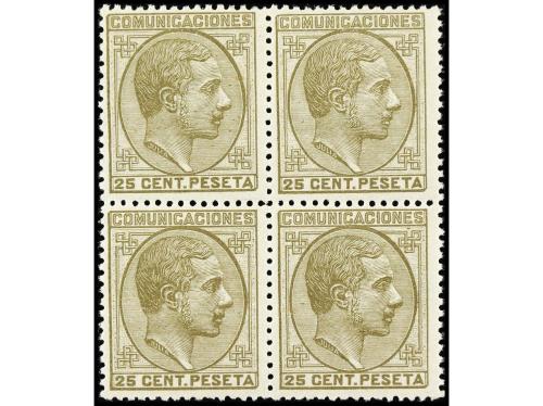 ** ESPAÑA. Ed. 194 (4). 25 cts. sepia. Bloque de cuatro, excelente centraje. LUJO. Cat. 152€.