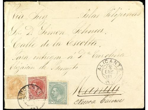 ESPAÑA. Ed. 201, 202, 206. 1881. ALICANTE a MANILA y reexpedida a NUEVA CÁCERES DEL SUR. 5 cts. verde, 10 cts. carmín y 50 cts. naranja. Precioso y raro franqueo tricolor circulado a Filipinas.
