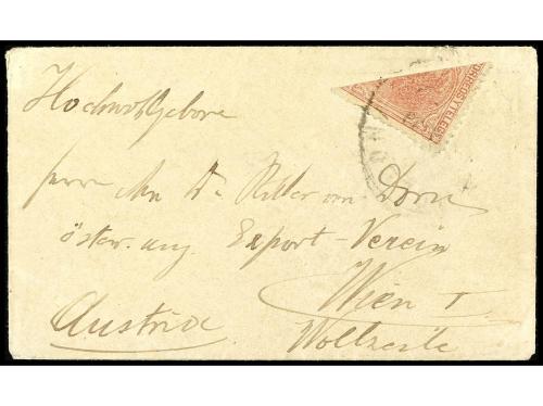 ESPAÑA. Ed. 202. 1880. BARCELONA a VIENA. Pequeño sobre para tarjetas de visita circulado con sello bisectado de 10 cts. carmín para hacer la tarifa especial de 5 cts. para este tipo de envíos. RARÍSIMO. Cert. CEM.