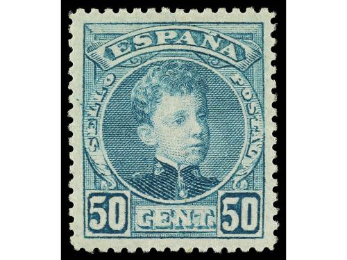 * ESPAÑA. Ed. 252ec. 50 cts. verde claro ERROR DE COLOR al dorso numeración A000,147. Centraje excepcional, rarísimo en esta calidad. LUJO. Cert. GRAUS. Cat. 1.975€.