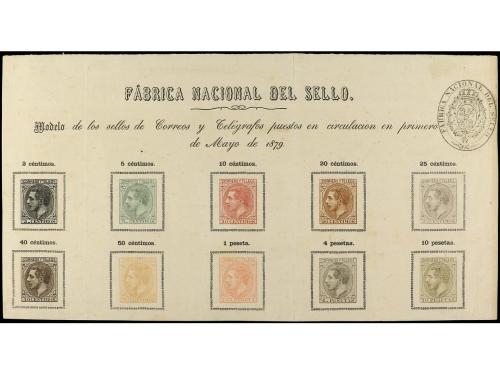 ESPAÑA. Ed. 200/09. HOJA MODELO para la emisión del 1 de Mayo de 1879 con la serie completa impresa sobre la cartulina. Cat. 2.200€.