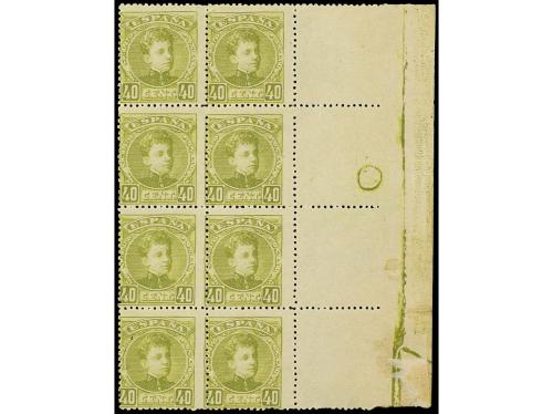 ** ESPAÑA. Ed. 250 (8). 40 cts. oliva. Bloque de ocho, sello muy raro sin fijasellos. Cat. 1.720€.