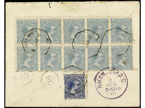 ESPAÑA. Ed. 213 (10), 215. 1898. BARCELONA a ALEMANIA. 2 cts. verde (10) y 5 cts.azul. Rara combinación de franqueo para hacer los 25 cts. del porte.