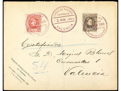 ESPAÑA. Ed. 241, 251. 1909. VALENCIA correo interior. 2 cts. sepia y 40 cts. rosa, mat. especial PRIMERA EXPOSICIÓN FILATÉLICA DE ESPAÑA, al dorso llegada. Raro el 40 cts. en carta.